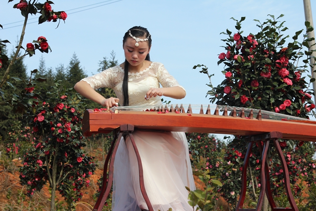 在活動現(xiàn)場,一朵朵茶花競相開放,或紅或白,迎風(fēng)搖曳,春意盎然,茶花仙女們步入茶花基地,惹人心醉。舞臺上,走秀、歌舞、古箏演奏等節(jié)目精彩紛呈?!皾M山的茶花太美了,節(jié)目也很精彩,和朋友拍了很多照片,很開心?!鼻皝碛瓮娴臈钆空f道。